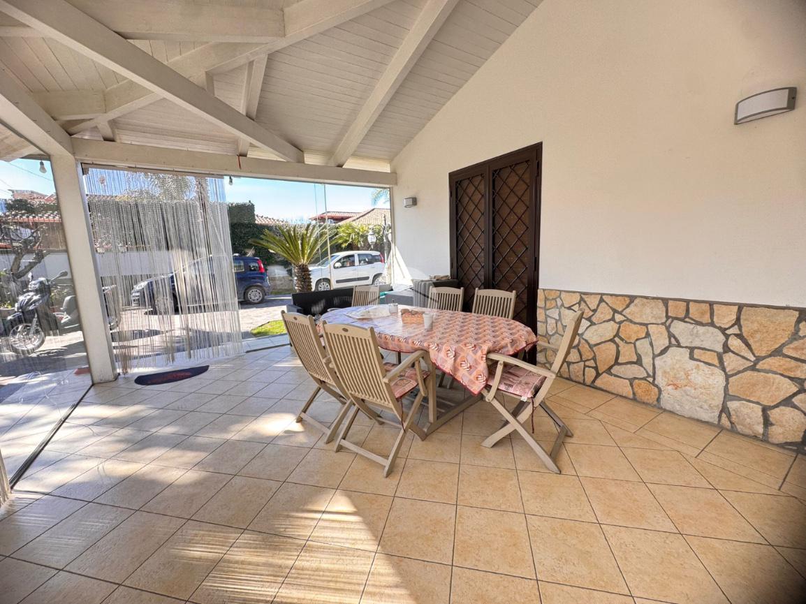 Il box auto, che copre l'intera metratura della villa, offre comodità e sicurezza, mentre il giardino che circonda la casa su tre lati è un vero paradiso. Con alberi da frutto e palme, è uno spazio che invita al relax e alla convivialità. Completa questo incantevole quadro una cucina esterna e un bagno, rendendo il giardino perfetto per cene all'aperto e momenti indimenticabili con amici e famiglia.