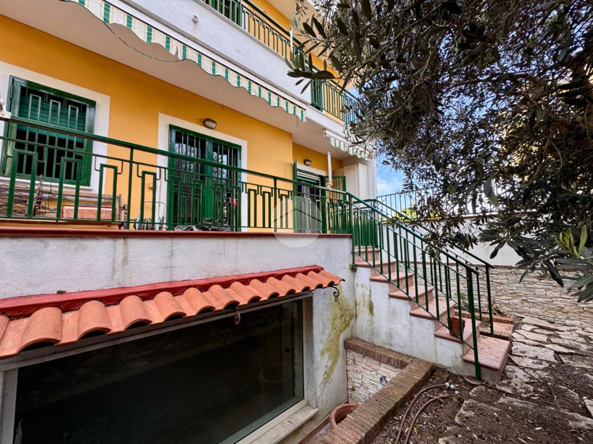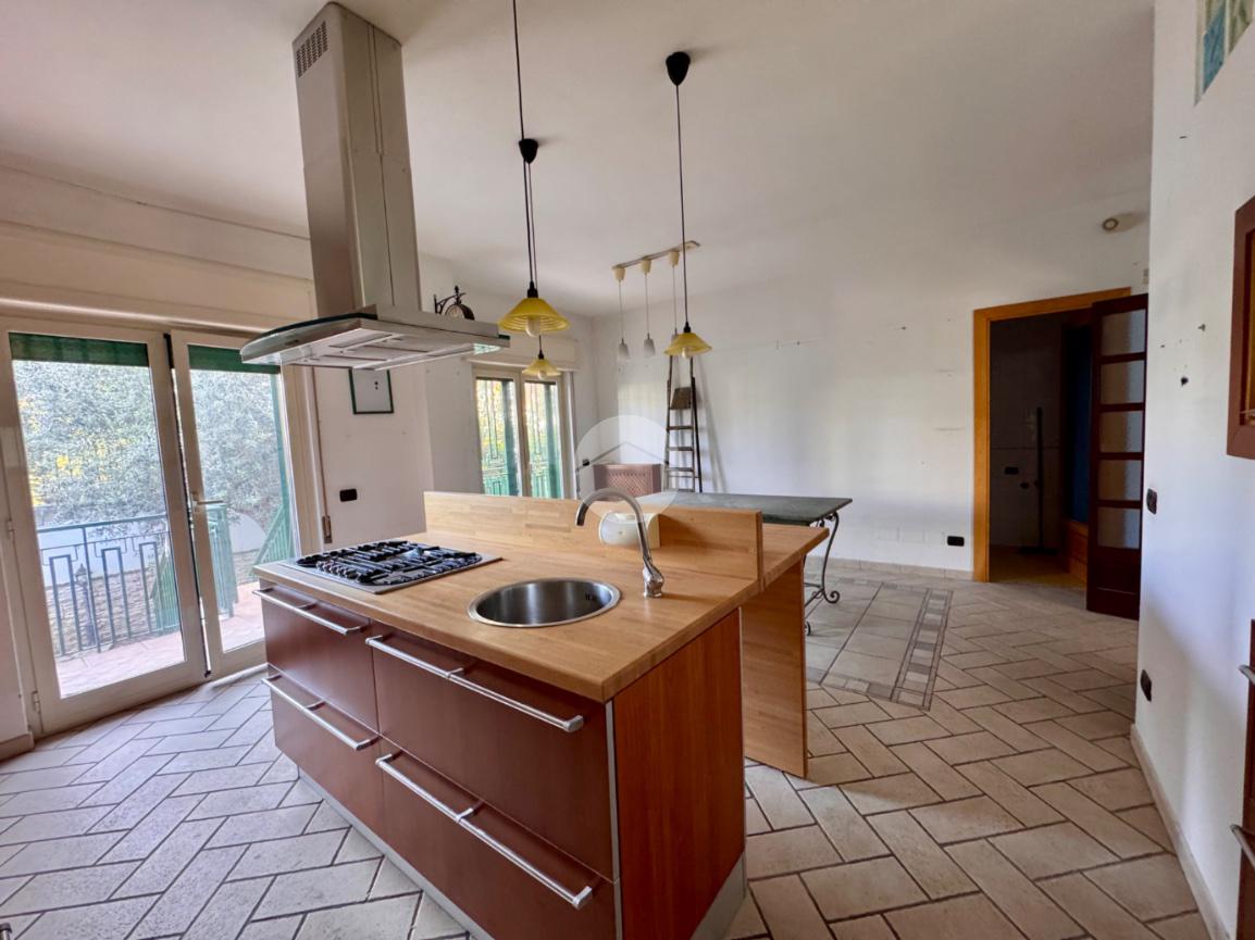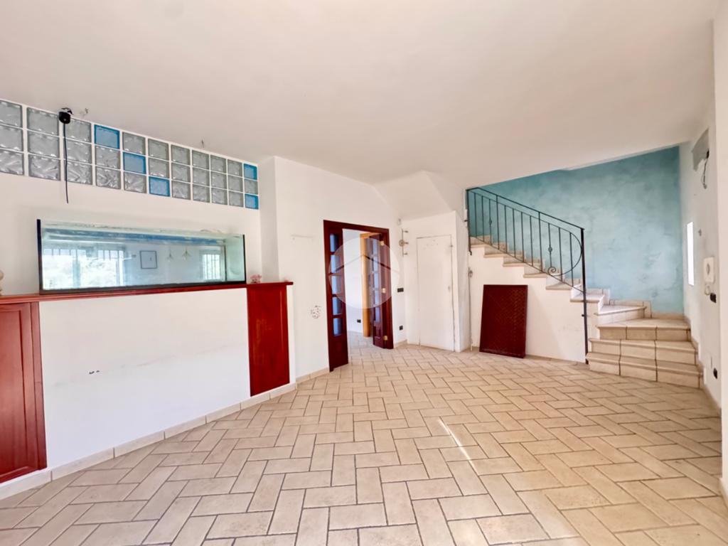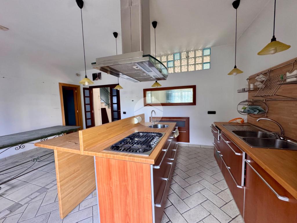 L'accesso alla villa avviene attraverso un affascinante patio che conduce al terrazzino, da cui si entra nel salone principale. Questo spazio ampio e luminoso è il cuore pulsante della casa, ideale per accogliere momenti di convivialità. Una porta scorrevole separa il salone dalla cucina, un ambiente spazioso e confortevole, perfetto per le esigenze di famiglie numerose. La cucina, con il suo arredamento su misura che verrà lasciato in dotazione, vanta un doppio affaccio su un balcone che si apre su un giardino impreziosito da un maestoso albero d'ulivo. A completare questa zona giorno troviamo un pratico bagno di servizio.